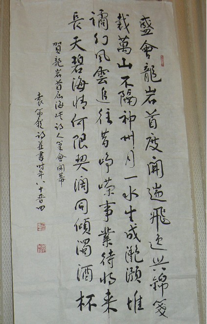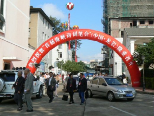 隆重的筆會開幕式於閩西賓館馨蘭廳舉行,大門佈置著慶祝首屆筆會召開的拱形紅門,與高懸的紅氣球相互輝映,還有儀隊奏樂以示歡迎,會場內大廳兩側懸掛許多書法詩賦的卷軸,其中有一首寫道: