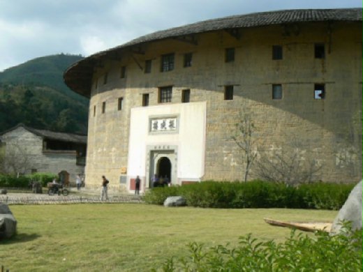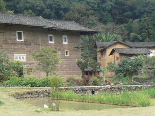 我們第一天去遊覽聞名遐邇的客家土樓永定「振成樓」其實一路上都可看到大大小小的土樓鑲嵌於梯田上、溪岸邊,不時映入眼簾的是古早味十足的農舍,小橋池塘、水牛、雞、鴨、鵝群點綴於田野間,還有一叢叢翠綠款擺的毛竹,一棵棵紅柿纍纍的果樹,彷彿置身於古意盎然的國畫中,使我不禁哼起童謠來:「我家門前有小河,後面有山坡,山坡上面野花多,野花紅似火,小河裡有白鵝,鵝兒戲綠波,戲弄綠波鵝兒快樂,昂首唱清歌。」