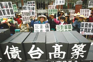 立法院院會昨天表決通過「重大國防投資暫行條例草案」付委,反軍購大聯盟對政府債台高築,將錢拿來買武器,抗議國民黨與民進黨聯手欺騙人民。聯合報記者邱勝旺/攝影