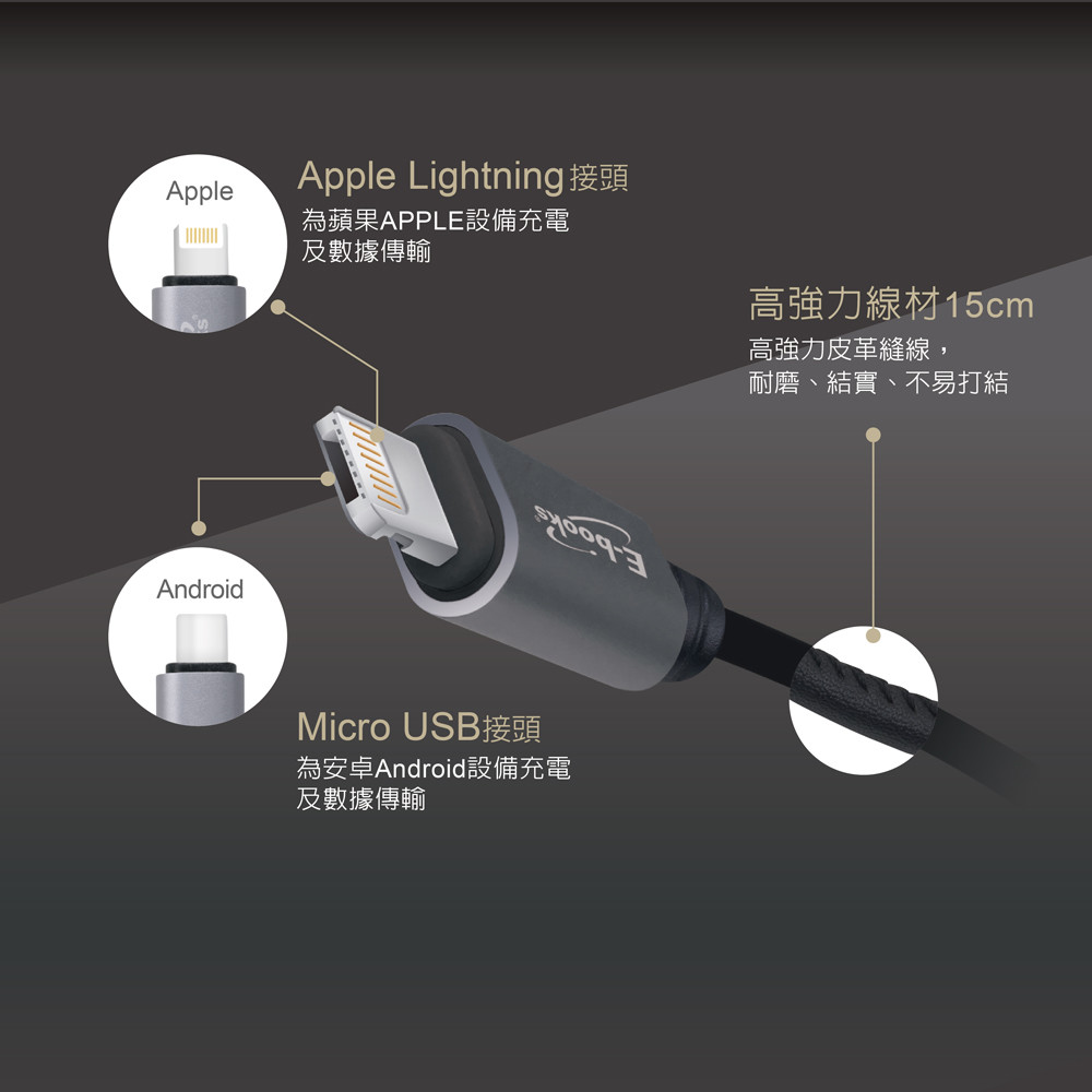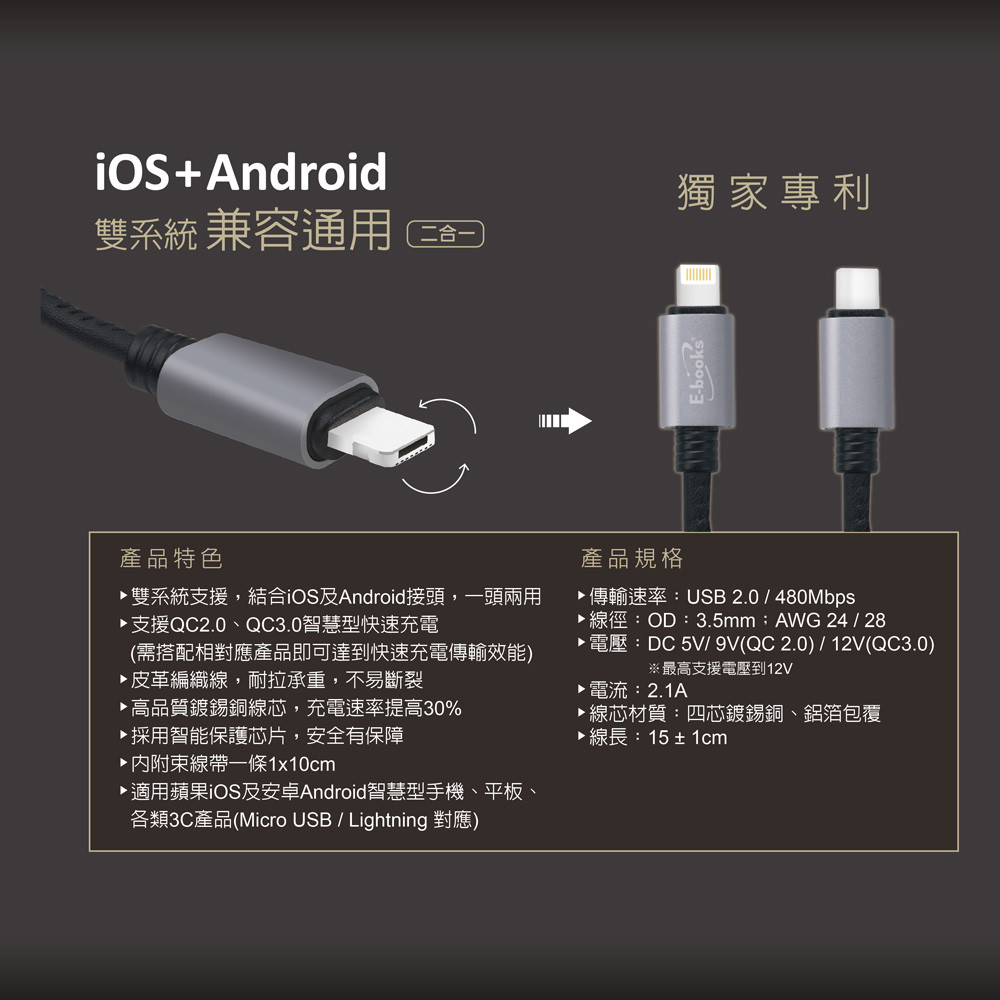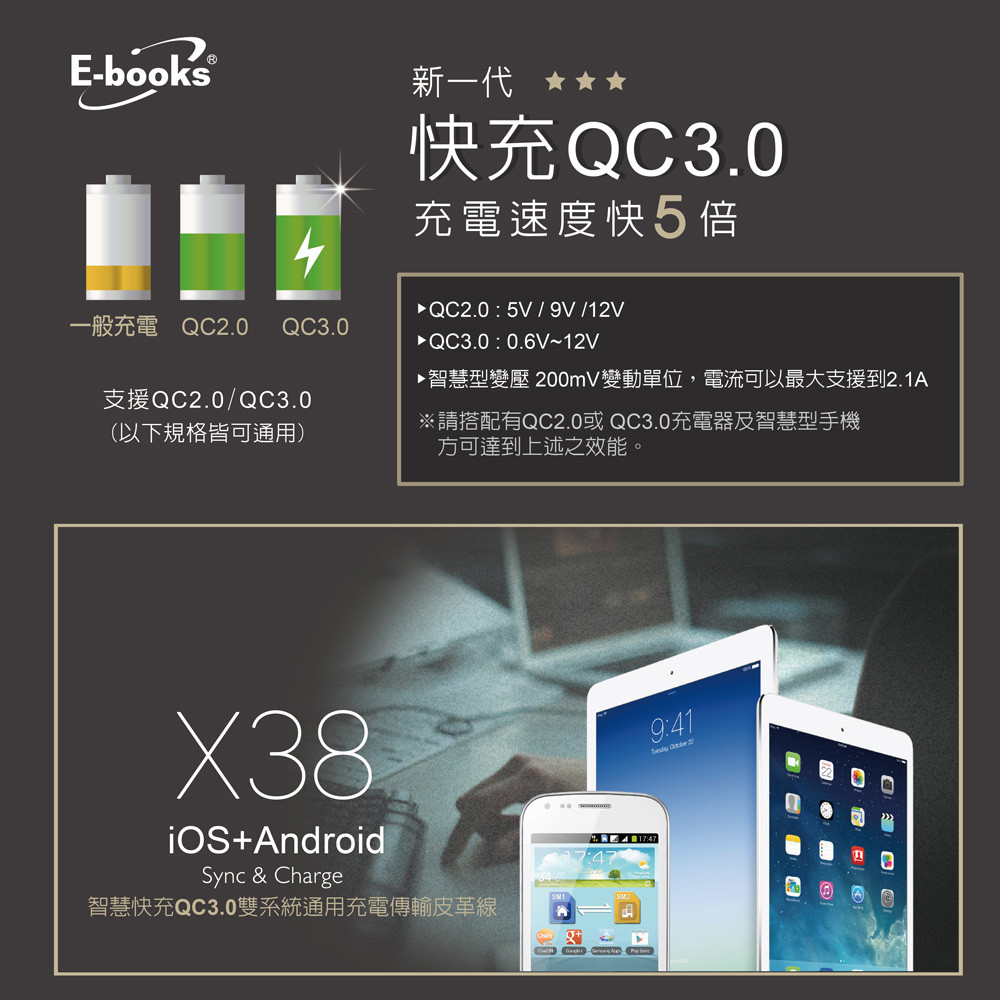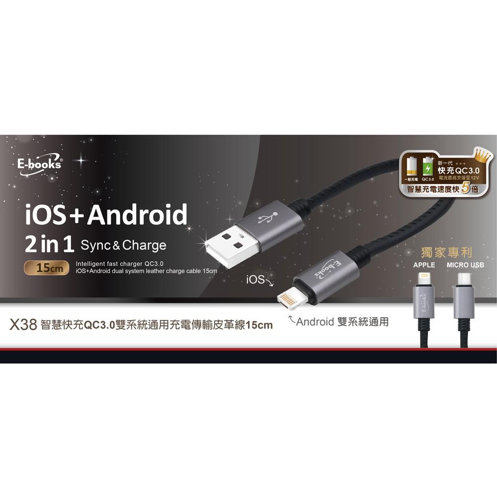 E-books X38 智慧快充QC3.0 雙系統通用充電傳輸皮革線15cm