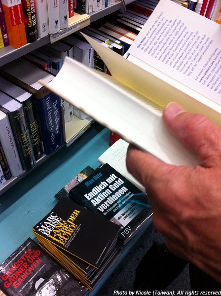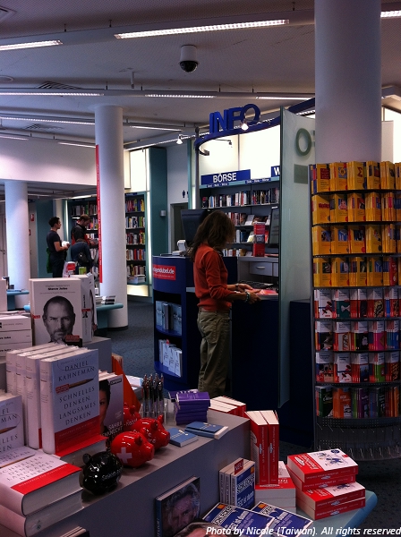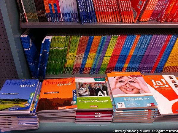 從各地來到慕尼黑學語言的人多,當地的人學其它國家語言-如西班牙,葡萄牙,俄羅斯語,中文的人也不少,因此書店裏也有一個區域陳列了語言學習講義,文法書,字典。我在這裏也看到語言中心裏使用的教材書,售價比語言中心少1 cent。照片最右邊切得了一角的老德最初買給我的德文學習本,後來自己又再買了左邊數來第二本當輔助講義,打算在前三個月上完德文後暫停一個月左右,做做這兩本學習本的練習,讓前三個月的學習較為札實之後再進到下一個階段。