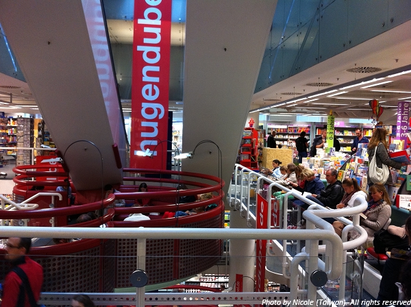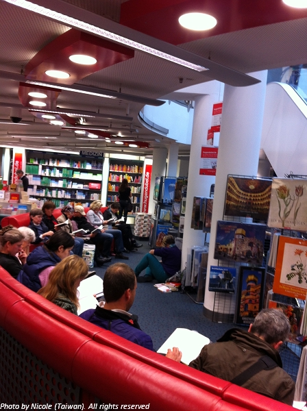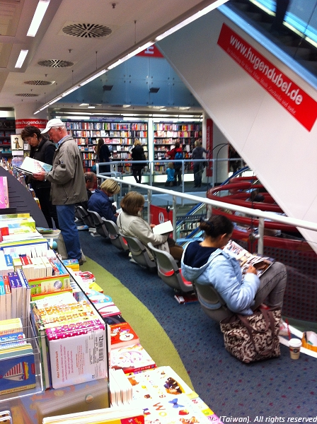 書店大概是有五層樓吧?其實我還蠻懶得記這麼詳細的。樓層間或是樓梯間都設有許多椅子,供大家在店裏享受閱讀。這是讓我印象深刻且非常開心的事。德國人很喜歡閱讀,早上出門上課搭乘地鐵,總會見到不少人拿本書讀著,形成一種搭乘閱讀的文化。假以時日我也會是這樣的一員吧-只要我別在趕去上課的車上補眠的話。