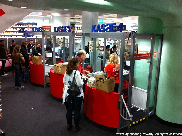 書店裏設有電梯,也有手扶梯。下樓時手扶梯只到某個樓層,然後就要循著中央的樓梯轉下樓,來到結帳櫃台。若沒有買書的話,也可以直接從右邊的出口走出去。一樓則另外有結帳櫃台,供在一樓購買書籍,影片,或是文具行事曆等物品的消費者結帳,一樓外則會有幾車特價中的書或是旅遊書,價格實惠,可以尋寶。我覺得德國這裏很信任個人的行為操守,於是也更希望這樣的互相尊重以及自我約束的文化可以長長久久。