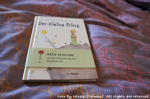 但其實原本最重要的是想在書局裏找有沒有德文版的小王子,我跟老德都很喜歡小王子,但當時在兒童區並沒有找到。後來自己來逛了一次,欣喜的在兒童區找到一本大本的小王子立體書,只是它被翻得破舊帶有折損。之後再一次下課後獨自去逛書店時,真的找到一本小本的德文版小王子,很開心的買下帶回家。老德也很高興,說它可以唸給我聽。但其實後來我們每天上班上學,晚餐後老德幫我復習預習德文,等到洗完澡睡覺時也都已經半夜,因此我也還沒能聽老德唸這本小王子給我聽。倒是老德自己睡前會翻個幾頁,因為他也非常喜歡小王子這本書。前幾天起床後還告訴我-他覺得畫羊的那一段好有意思。