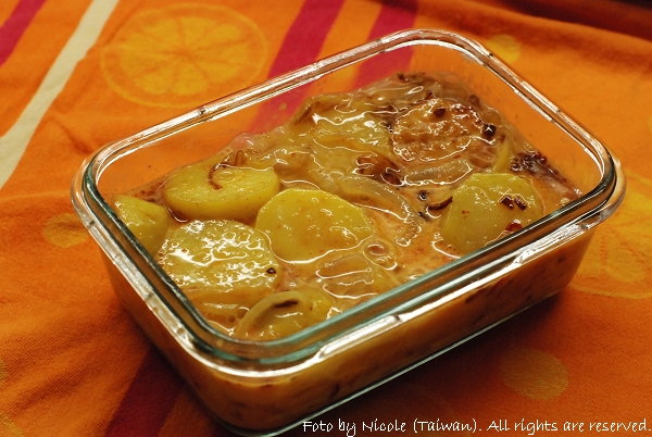 我從台灣帶了幾本料理書來,翻了好幾個月,卻沒依樣做出什麼。主要原因是要嘛缺器具如烤盤,攪拌器等等,要嘛缺調味料或香料。想的都是─欸,我根本不清楚自己下廚的熱度有幾分,要是買了一堆,卻只是當擺飾,太浪費錢了。最後在老德的曉以正義之下,進了華人超市一次買足了中式醬料(連辣豆瓣醬都買了),以及後續老德想要做甜點(超市賣有許多糕點方便包,回到家只要加入雞蛋牛奶等常見材料即可)而追加買的烤盤、攪拌器、簡易磅秤,突然之間所有需要的器具材料都到位了,我們晚餐從週四晚上開始有了變化(爾後則看我們的廚房主夫主婦魂燃燒程度或是懶夫懶婦的發懶程度決定)。