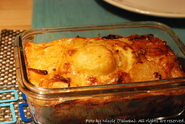 我跟老德說好了,週四晚餐我負責。這算是試作第三道食譜菜色─西班牙馬鈴薯蛋餅(註1)。主餐則是烤鮭魚。謹記2013年新年新希望,我只用了五顆馬鈴薯,大概450g左右(以前老德一餐會用掉至少8顆馬鈴薯,吃得好撐),依照書的步驟煎香了洋蔥也煎熟了馬鈴薯。接下來是要將它們放涼之後再加入蛋以及調味料,最後才進烤箱。