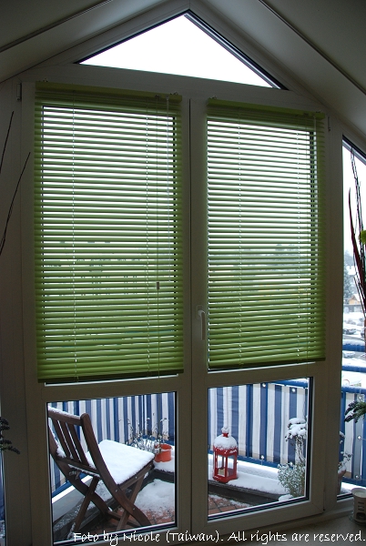 一覺醒來,前兩天下了又退下了又退的淺薄雪景,週六這早上倒確確實實的給足了1.5公分的積雪。陰天裏窗外的雪景反倒比天空還明亮,陽台外的紅色燭罩上也覆蓋了一些白雪。白天此時我們才看見綠色窗簾的效果─非常滿意啊!
