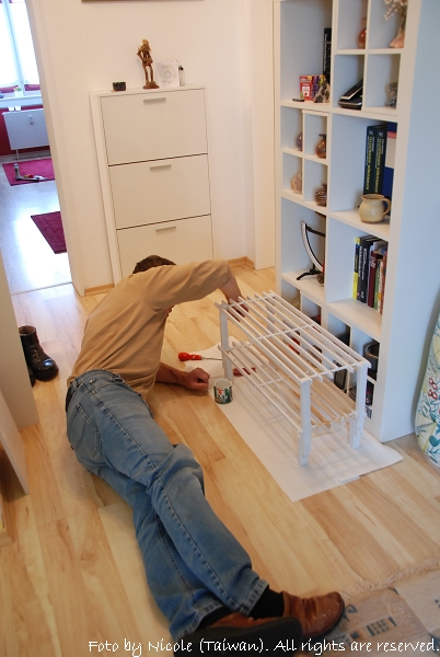 我在廚房,老德則忙著打點居家生活品質。先是在客廳的角落找他的工具盒,又進了臥室開始鋸木塊,他今天的任務之一將後來擴充的便宜雙層鞋架加高,成為三層。