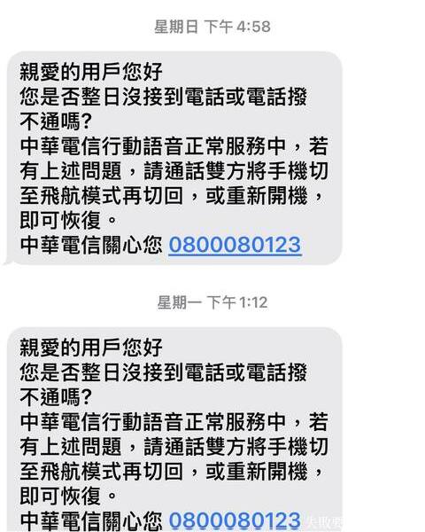 中華電信的簡訊強調:行動語音正常服務中