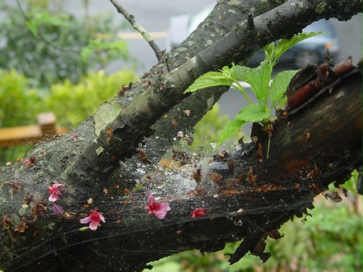 圖一:近來春雨直直下,新竹縣尖石鄉的櫻花被春語打落,所剩無幾。這棵櫻花樹近來才冒出翠綠的嫩芽,也是蜘蛛結網的好地方,沒想到才剛織好的網,卻遇上春雨,雨水帶著被打落的櫻花,被網在蜘蛛網上,意外網住了春天的美麗。