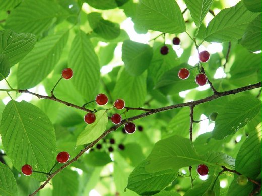 圖二:新竹縣橫山鄉大山背是最佳的賞櫻據點,已被廢校的豐鄉國小前,四周遍植櫻花,花開時整座山都變成豔紅色的,現在花已謝,抽出嫩綠色的枝芽,遊客從樹下抬頭看,即可看到類似櫻桃的山櫻花果實,紅豔豔的掛在枝頭,看來相當可