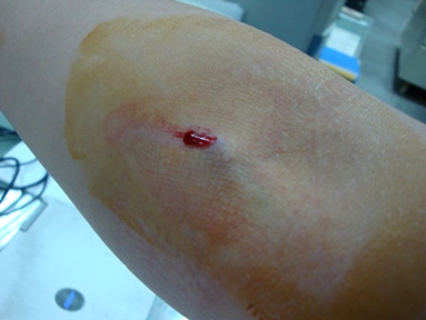 恐怖的事發生在最後!捐血完,我回警局寫稿,兩個小時後才把繃帶解開,不料這時血卻不斷流下,我慌亂的拿衛生紙擦,卻越擦血越流!旁邊的偵查佐看我不斷拿衛生紙,張大著嘴問”你還好吧?”當我感激的看著他,他下一句卻接”那個~血不要亂滴,不然等下還要擦地板~”