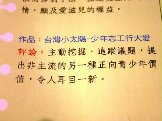 不要再跟我說什麼媒人婆獎了啦!),獲獎的主題為「台灣小太陽-