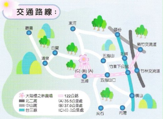 「櫻之林休閒農場」位於竹縣五峰鄉大隘村14鄰270-1號,電話:(03)5851621、5851797,營業時間為周一至周日早上8時至晚上10時。