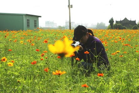 回程路上,發現路旁花開遍野,農民在田裡種上波斯菊做為「綠肥」使用,熱情綻放的花朵,讓大家的壞心情開朗了不少。我下車走到田中彎身拍照,被其他記者拍下了這張漏網鏡頭。