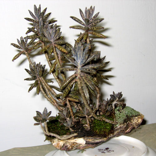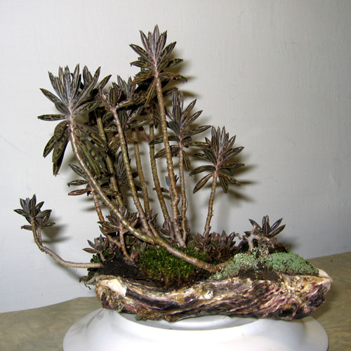 幾年前種過不死鳥,後來清理花盆,改種別的花卉;沒想到牆角遺留一小叢,模樣有點像迷你的樹林,於是取出從餐廳拿回來的蚵?,將兩者組合起來,再加上青苔,就成了有趣的迷你盆栽