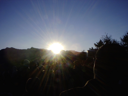 早上四點了, 大家都閉著眼睛的起床去看日出, 我們早上又搭了小火車, 又爬了高山, 終於到了看日出的地點, 我們抬頭 仰望著天空, 在山上真是 人山人海, 我們等了好 久, 終於金光四射的太陽出現了, 它像一顆蛋黃從雲海突然跳出來! 五顏六色的雲 朵在天空中 隨風飄逸, 美極了!