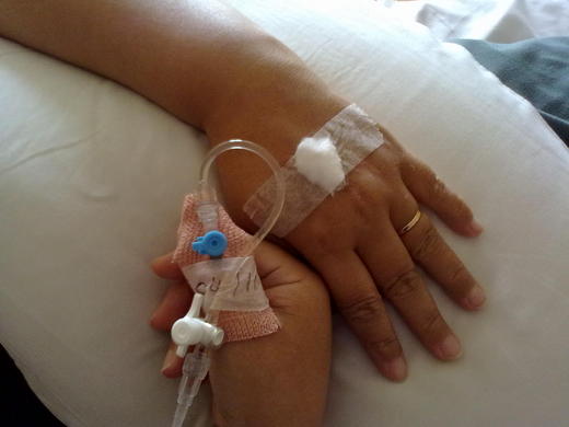 可是我的血管越來越難找, 護士長加兩個小護士, 半個小時還沒有完成. 英國ㄤ站在我左手邊握著我的手,猛幫我擦汗,