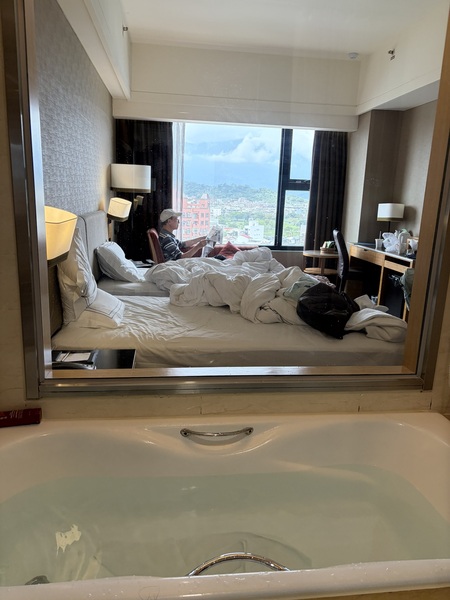 吃飽喝足,迎著冷風騎回那間有提供優質自行車的飯店。最完美的時刻,就是放滿一浴缸熱水,整個人泡進去!一邊泡澡,一邊透過浴室的大玻璃窗,看著遠方雲霧繚繞的中央山脈和花蓮市區的街景。