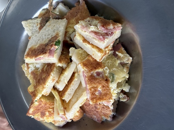 我點了一份火腿蛋餅,鐵板烙得金黃,切成小塊堆在金屬圓盤上。外皮酥脆,裡面的蛋嫩得恰到好處,火腿鹹香,咬下去有一種樸素的滿足感。