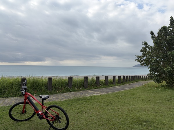 我租的是 DOSUN 電動自行車,紅色車身在綠草地上特別搶眼。沿著海堤旁的單車道騎,一邊是草地與木欄,另一邊是礫石灘和無邊際的太平洋。遠處有山的輪廓若隱若現,低雲壓著海面,整個畫面像一幅淡彩水墨。