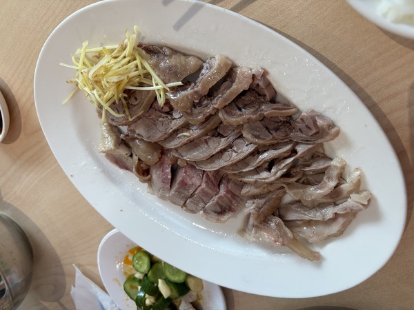 重頭戲是這盤白灼薑絲鴨肉片!薄薄切開,鋪滿整個橢圓白盤 。鴨肉皮脂豐腴不膩,帶點嚼勁,薑絲去腥又添香氣 。旁邊還有一小碟拍黃瓜,酸甜爽口,解膩一流 。