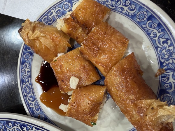 這盤酥炸春捲,裹著薄脆的外衣,裡頭料實在,配了深色醬油膏和橘紅色甜辣醬——各有各的調性。炸得油亮亮的,夾起來還在冒油,但就是那種讓你忍不住再吃一口的罪惡感。