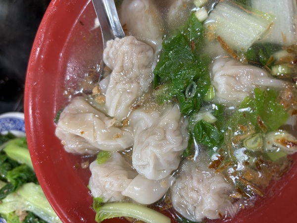 最後壓軸的是這碗餛飩湯。大紅碗盛著清澈的湯底,幾顆皮薄餡厚的餛飩浮在表面,加了青菜、蔥花和一撮蝦皮提鮮。湯頭喝起來淡而不薄,鮮味是那種後勁慢慢來的層次。在冬天的花蓮,捧著這碗湯,真的會覺得人生很好。