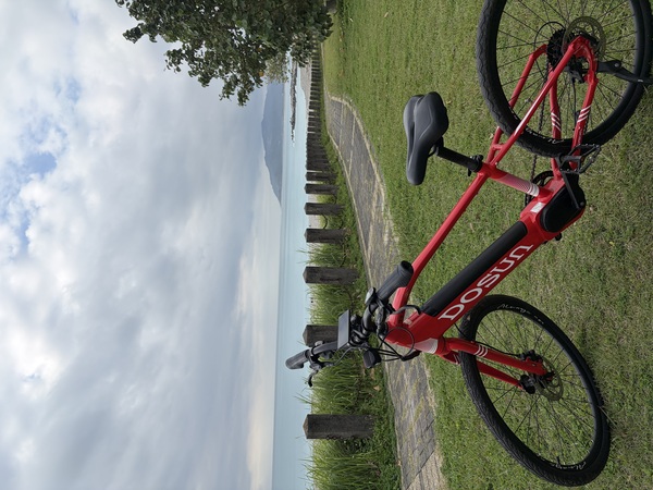 紅色 DOSUN 騎在綠草地上特別顯眼 。沿著海堤旁的單車道騎,一邊是草地與木欄,另一邊是礫石灘和無邊際的太平洋 。遠處有山的輪廓若隱若現,低雲壓著海面,整個畫面像一幅淡彩水墨 。