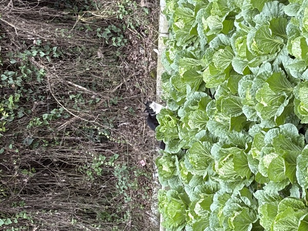 穿過一片高麗菜田,發現一隻黑白貓端坐在田埂上,圓眼睛炯炯有神,正在審視每一棵菜的生長狀況。牠不怕人,只是淡定地看著我們,像個盡責的田園警衛。