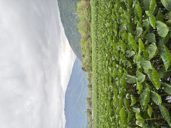 再往南,出現大片芋頭田。圓葉寬大如扇,積著細小的水珠,遠山若隱若現。這個畫面,應該是今天最接近「山水畫」的一刻。