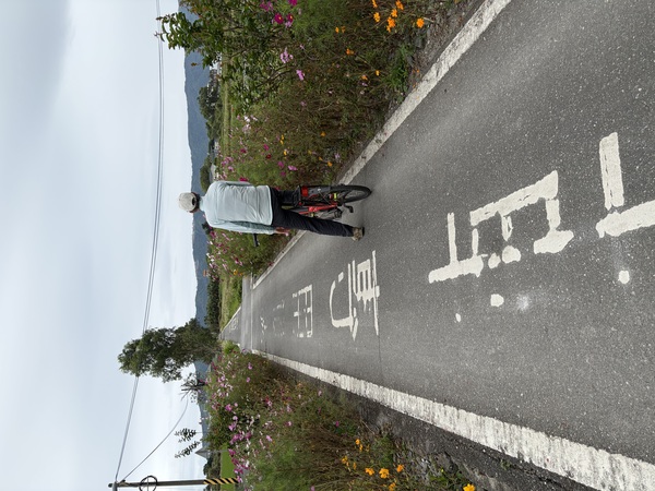 兩側的波斯菊開得毫無保留,粉紅、橘黃、紫羅蘭,在灰白的天色下格外鮮豔。推著車慢慢走,花就在手邊,山就在遠方。