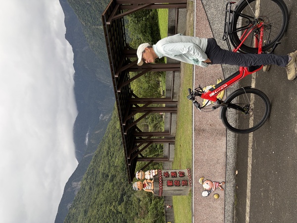 中央山脈就在面前,峰頂埋在雲裡,只露出稜線與墨綠的森林。原住民圖騰的地標牌立在路邊,兩個卡通人物坐在上面,笑著歡迎每一個踩著單車來的旅人。