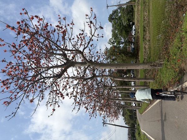 路邊突然出現一排木棉樹,高大、挺拔,枝椏光禿禿的,卻頂著一簇簇橘紅色的花,在藍天白雲下燃得像一把把火炬。