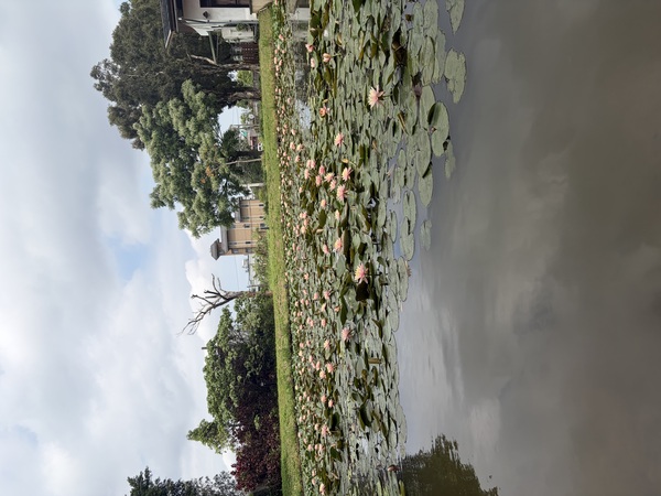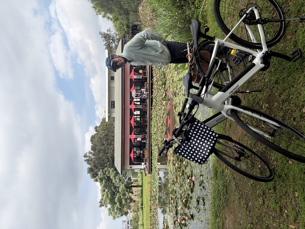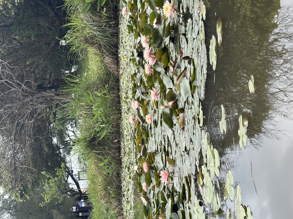 粉色的睡蓮安靜地開著,一朵、又一朵,葉片交疊,水面倒映著遠樹的輪廓。後方的咖啡館掛著紅色洋傘,隱隱傳來人聲。兩輛單車並排停在池邊草地上,構成了今天最完整的一張畫。