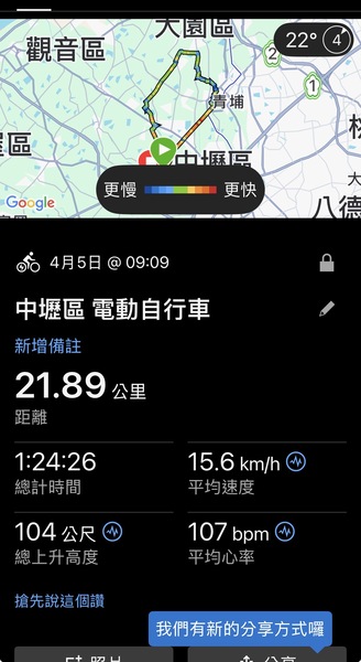 距離:21.89 公里|時間:1小時24分|平均速度:15.6 km/h|上升高度:104公尺|平均心率:107 bpm
