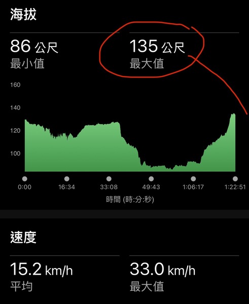 青埔一帶兜了一圈,掉頭往回。回程才真正知道去程有多順——海拔要一點一點還回去,踩起來腿有感覺,心率也跟著爬。最低跌到八十幾公尺,最後再爬回一百三十五,這段上坡,是今天給自己留的功課。