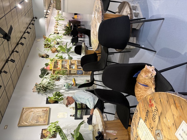 相對平緩的地形,讓騎乘節奏變得輕快,平均速度提升至 15.0 km/h,心率也降到了輕鬆的 98 bpm。中途,我們停留在一家植物咖啡廳休息。灰色的牆面上,掛滿了幾十盆姿態舒展的鹿角蕨,店內還有一隻戴著藍色蝴蝶結項圈的橘貓安靜地穿梭著。在這樣一個充滿綠意、安靜的空間裡喝杯水、歇歇腳,讓心跳慢慢平復。