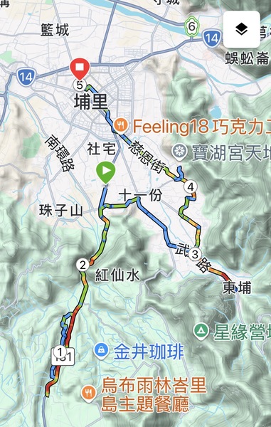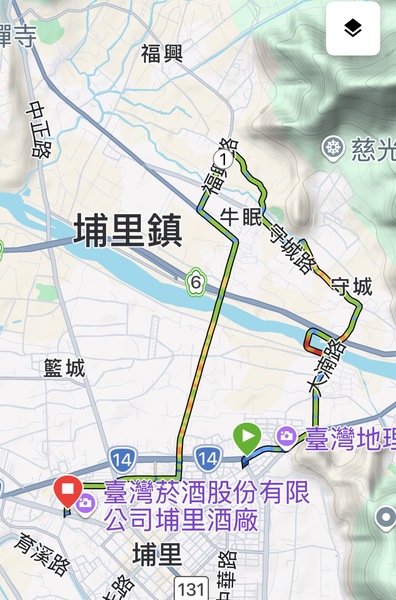 下午的路線選擇在埔里的外圍繞行,從福興路經過牛眠、守城,再從臺灣地理中心碑附近接回市區。