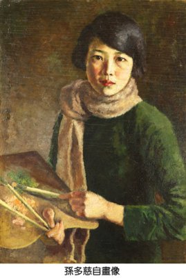 何恭上說:"極具徐悲鴻風的「孫多慈自畫像」,是1934年畫在三夾板上;21歲的她正是青春年華,穿著暗青綠外衣,淺紫圍巾,右手拿調色盤,左手拿筆,那也正是為情所困,淬煉後的生命情懷,畫中像像百合花綻放,眉宇間委屈,有無人訴說的苦楚。"
