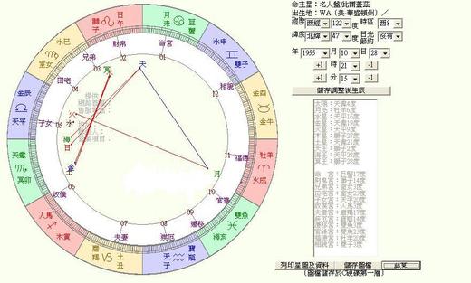 其實從比爾的星盤可以看出在一宮中有顆月亮與天王星的120度合相位,此藍色相位就是可以讓比爾的成就與財富表現突出的能量,一般來說在生命星盤的合相位,通常是我們天生最正面的能量,也是能量特質較強的類型,至於星盤上紅色星體相位就是屬於能量較弱的特性,通常這類型相位也是生命的天份之一,但是也是屬於障礙重重的發展方向,但是如果能突破這類型的相位,那也代表他已經能徹底從失敗中記取教訓,然後轉往正確的作法去修正!然而像這樣的人並不多,因為大部份的人都很難在失敗中徹底記取教訓與加以修正自我缺失。