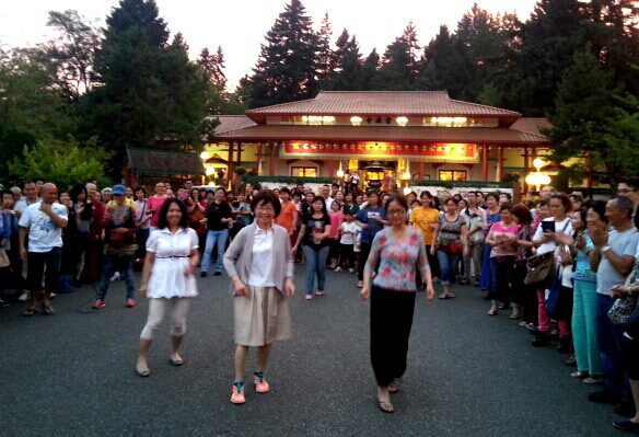 是日傍晚時分,師尊師母與眾弟子們聚在 西雅圖雷藏寺前同樂,師母特別獻舞供佛,身段輕巧流利,