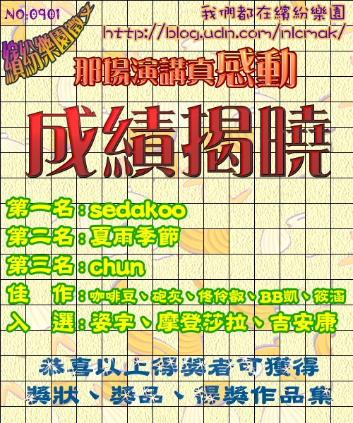 感謝網友們熱情的參與,經過謹慎地評審之後,成績終於揭曉!以下為得獎名單: