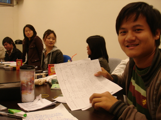 今天很有趣──「田野調查」,沒有真的到田野,一樣在CITY CAFÉ旁的教室,不過邀請來了兩位朋友。來自泰國的Sevenwei與蒙古的小巴。我們使用Swadesh的一百字清單,調查了水語、雲南擺夷、泰語、蒙古語的前三十個字。Sevenwei講水語與雲南語,他很厲害,懂很多語言。不禁使我想到那些馬來西亞的僑生,也懂不少語言。似乎,我的生活太單純,純的只剩下國語,還每天研究得樂此不疲或者麻木。我愛國語,我也希望也許之後能讀臺灣語言所。
