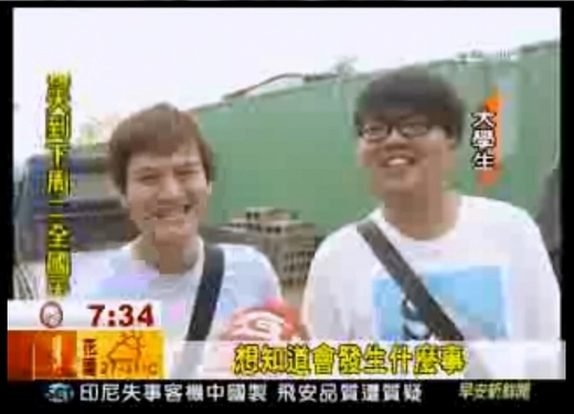 記者看見我們便前來採訪,真沒想到生平第一次被採訪竟然是在「末日」的前一天,當時心想著「媽,我上電視了!」果然,晚上媽媽就打電話來說她知道我上了電視,而當我回到宿舍,舍監見到我第一句話也說「恭喜啊!你上電視了呢!」我想,這樣的經驗實在太令我難忘了。