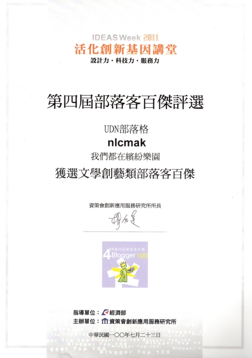 3.資策會第四屆文學創藝類部落客百傑(2011/07/06)