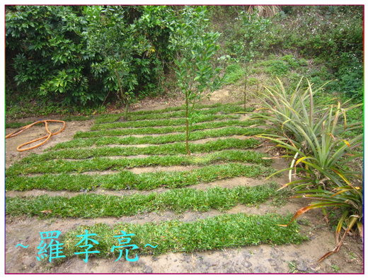 不過,不死心的我今年又試了一次,這一次只有試了大約七坪大的地方,買了像是操場在種的類地毯草的草皮,試試看能不能成功。經過了幾個月的觀察,發現到真的是有完全種草皮的地,果樹明顯的生長速度也來得比較快,證明了天生我『草』必有用,種了草的地方,別的雜草也比較不易生長,這草皮長起來或坐或臥,還滿舒服的。而且整理起來也滿漂亮的,未來如果能力夠的話,希望能夠再增加一些面積,這樣子以後也不用常常和這些草廝殺。