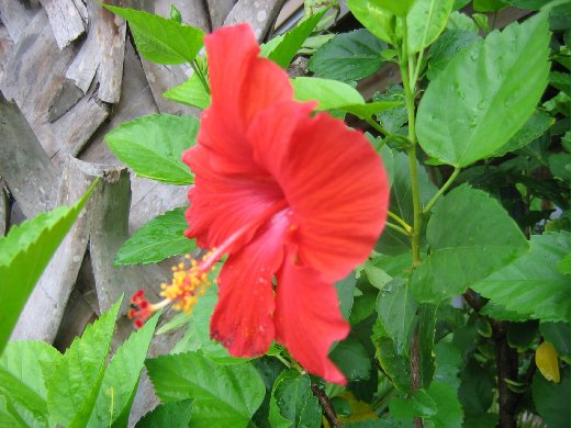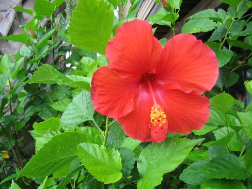 上網一察才知它叫朱槿,與木槿同一家族,俗名扶桑花、赤槿、大紅花、佛桑等,全年開花,有黃、桃紅、橙黃、白色等,但以深紅較多,故一般稱為大紅花。