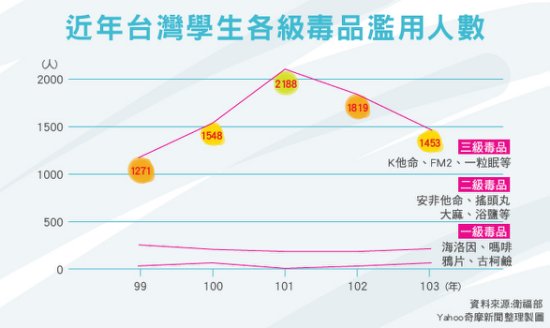 學生濫用藥物的品項以第三級毒品(如K他命)為最大宗,由於吸食、持有三級毒品,只要繳交行政罰鍰、參加講習,罰則相對輕微,使得三級毒品更加氾濫,警政署資料顯示,吸食、持有三級毒品的青少年人數,從民國94年到103年增加逾15倍,檯面下的數字恐更驚人。