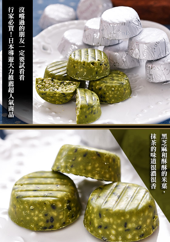 成分:砂糖、可可黃油、植物油脂、小麥粉、脫脂粉乳、全粉乳、黑芝麻、乳糖、抹茶、甘藷澱粉、低聚醣、麥芽抽出物、食鹽、乳化劑(大豆由來)、重曹、香料